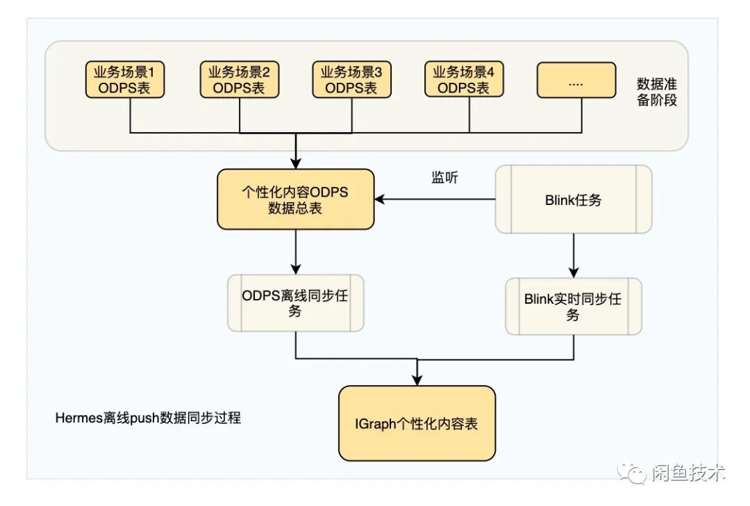 如何发掘用户个性化的内容呢?每个业务场景都会根据不同用户的历史行为产出一张个性化 ODPS 表,这里面算法会根据不同用户的特点产出不同的内容。此外,时效性也非常关键,计算出来的个性化内容如果几天后才发给用户,可能用户已经不感兴趣或者有新的关注点,如何快速同步产出的结果来及时发送给用户呢?