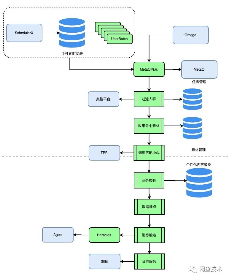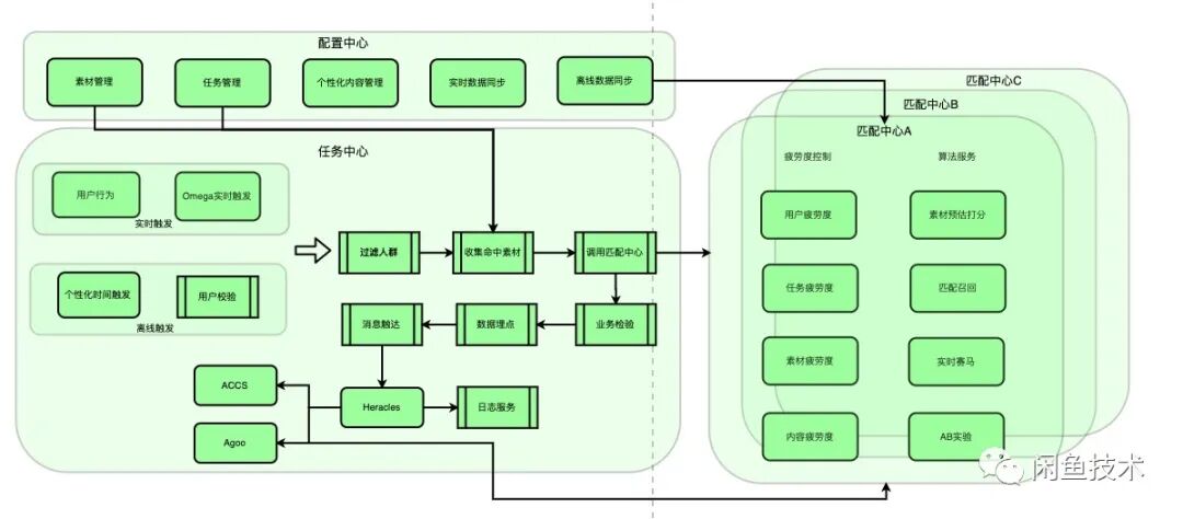 当整条链路触发之后,系统首先校验用户是否符合系统要求,如果符合的话系统会根据用户去查询用户命中的任务(其实是查询用户是否在某个人群中,还记得一个任务对应着一个人群吗?),根据用户命中的任务,通过配置中心找到对应的符合这个用户的所有的素材,然后将这个素材列表结合一些配置信息发送给匹配中心,匹配中心具体的功能下个段落会有仔细讲解,匹配中心返回决策”是否发送消息“给当前请求用户,如果发送,发什么素材以及发送什么内容;如果不发送,不发送的原因,便于做后期分析统计。如果发送的话,任务中心会进行业务参数校验,千人千面校验等一系列校验内容确保素材合理合法,然后记录数据埋点以及后期日志,最后通过闲鱼自研的消息下发渠道 Heracles 推送给用户,参见下图: