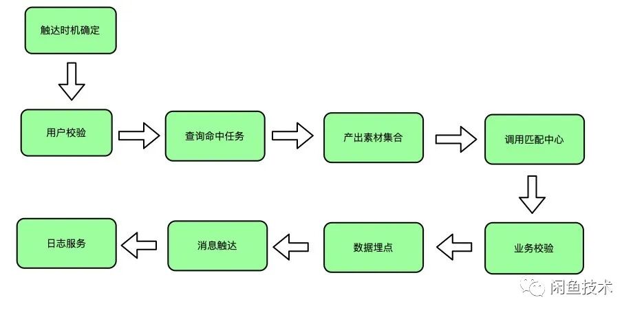 任务中心主要负责触达时机的确定,用户校验,计算任务素材匹配列表,调用匹配中心来判定是否对用户进行触达,业务校验,数据埋点,消息触达,整体链路如下图:
