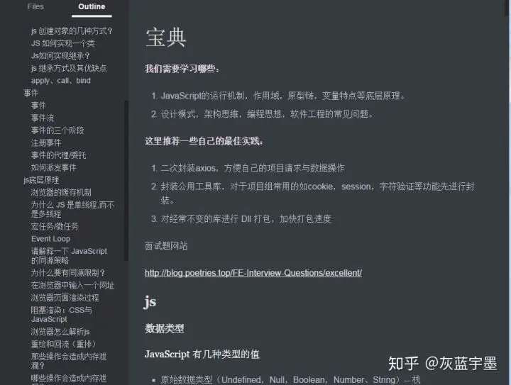 我参加过很多前端面试,每次都要花时间去准备哪些基础知识,自己是觉得很麻烦。所以我编写了一个自己的面试宝典,并按照知识点进行了整理分类。如果大家有时间也推荐大家这样做