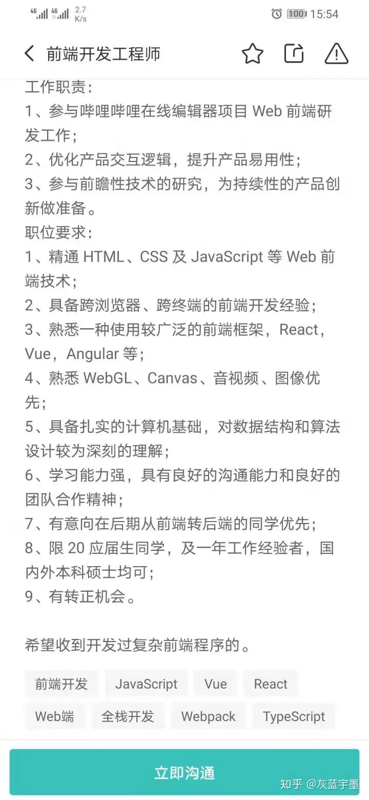 像b站这个招聘,我们在准备简历的时候就不能只侧重前端项目了,后端也要有涉及。如果有node项目开发经验一定要重点描述,你收到面试通知的概率一定比简历中没有涉及后端的其他应聘人员更高。