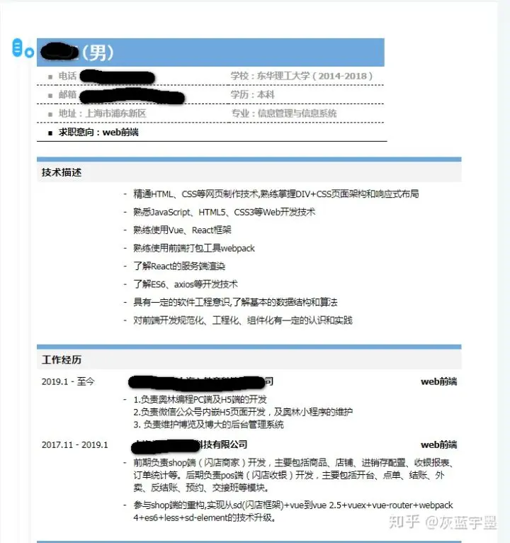 - 去年10月开始在知乎写文,如今粉丝5000+,公众号:前端码头
