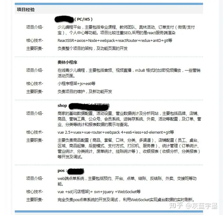 我个人觉得,好的项目描述应该是精简的,不要像老太太的裹脚布又臭又长的写一大堆。项目描述应该包括项目的类型、解决的问题、创造的营收、涉及到的技术、以及突破的技术难点,像什么个人中心、登录注册就不要去展开描述了,完全没有含金量。