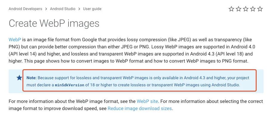 webp 压缩算法,相较于 pngquant、guetzli、tinypng,webp 压缩比更高,所以 webbp 压缩图片应该是更优的选择。但是 Android 设备对 webp 的支持存在兼容性问题,在 4.3 以上才完全支持。通过官网我们知道,想在应用中直接使用带有透明度的 webp,minSDK 至少需要是 18。