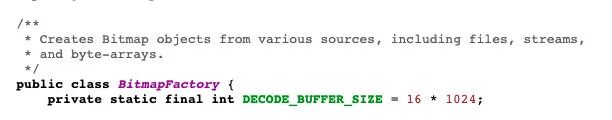 查阅所有加载图片的 api,都会经历 Resources 调用 getDrawable 的过程。会调用到 Drawable 的相关方法,然后通过 BitmapFactory 去解析不同的资源类型(File\ByteArray\Stream\FileDescriptory)为 Bitmap。由此可以推断出,BitmapFactory 是 Android 系统通过不同的资源类型加载成 Bitmap 的统一接口,这一点从 BitmapFactory 的类注释中也能看出: