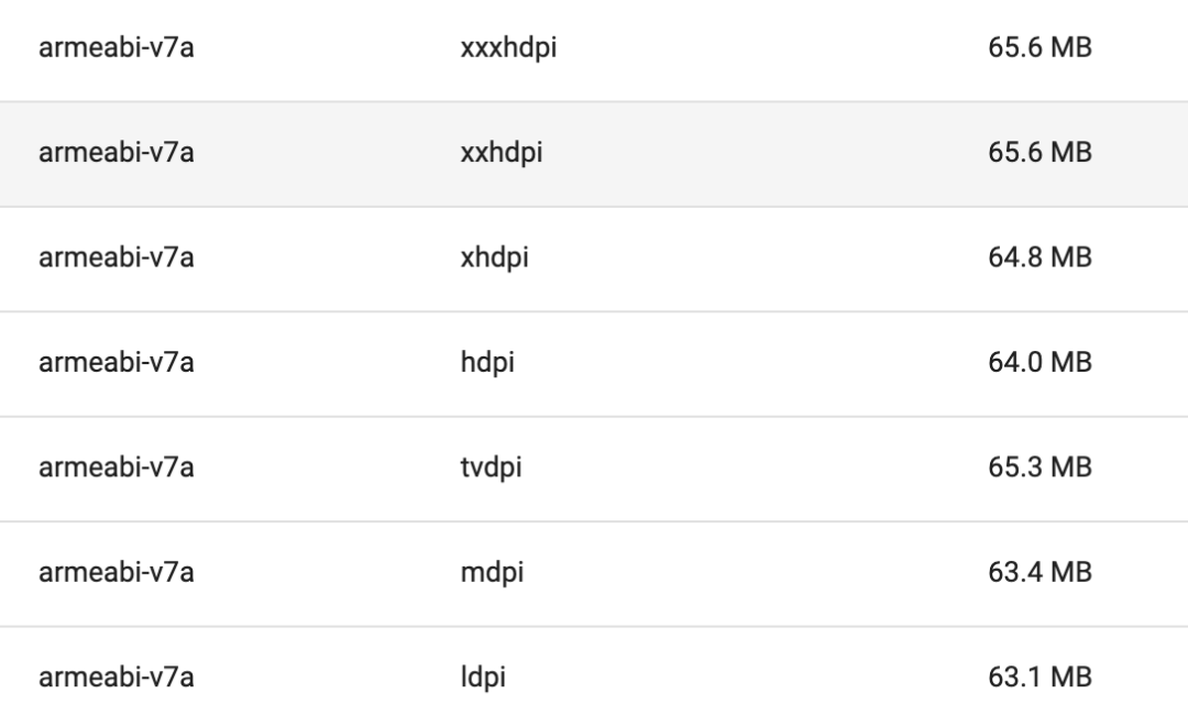 最终收益如图,公司内海外产品 TikTok 研发团队在使用该方案优化时,ldpi 相比 xxhdpi 减少了 2.5M 包大小。同时,低分辨率手机加载图片时直接加载对应 dpi 图片资源,不再需要对高分辨率图片进行缩放处理,提高了性能。