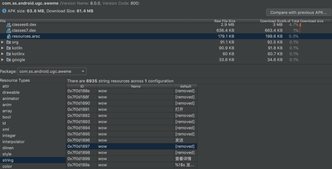 resources.arsc 这个文件在很多项目中都占用了相当多的空间。常见的优化方法是使用 AndResGuard 混淆减少文件名及目录长度,7z 压缩,如果有海外产品的话可以动态下发语言。我们在做完这些优化后,由于公司内部有很多海外产品,涉及到多语言的关系,ARSC 依然很大,我们决定尝试进一步优化。经过调研,最终我们对 3 个方面做了优化,分别是删除无用 Name、合并字符串池中重复字符串、删除无用文案,最终带来的收益是 1.6MB。在此之前,我们还在 AndResGuard 的基础上完成了重复 MD5 文件图片合并,原理是一样的。