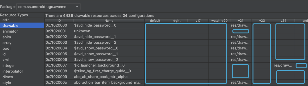 是什么导致了这样的空间浪费?我们可以看到下图中框选的空白,每一个都代表了其字符串所在的偏移值,这里并没有值,赋值 FF FF FF FF 作为默认偏移值,浪费了 4 字节空间。某些列(configuration)可能就只有几个格子有值,如图抖音中 drawable 有 4k+张图片,有 24 列,大多数 configuration 只有几张图片,因此浪费了 4k*23*4≈380k。大致估算,抖音可以减少 1M 体积。(压缩前)