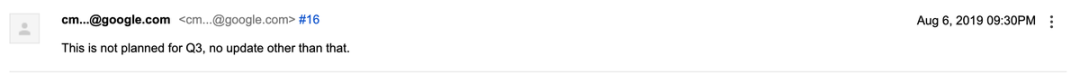 由此看来 Google 官方并不支持 App Bundle 使用 Dynamic Feature 时使用 shrink resource。在 Google Issue Tracker 上发现已经有人对此提交过 Issue 了,相关 Issue。而 Google 的回复也是简单粗暴----计划中,但是没有时间: