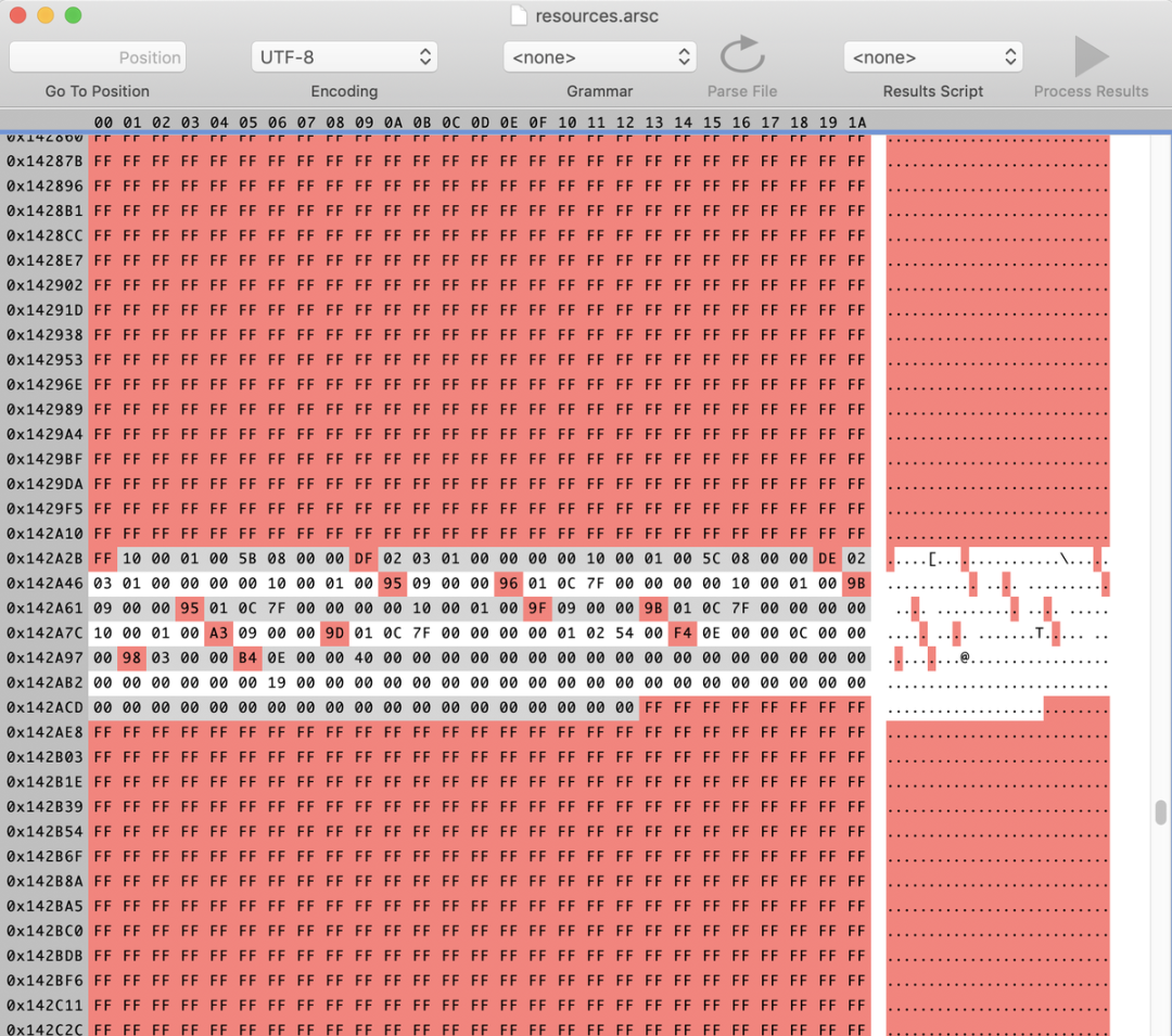 arsc 中的偏移数组是有优化空间的,我们会在未来尝试进行优化。用二进制编辑器打开 arsc 文件可以发现,这样的 FF 值在文件中大量存在。