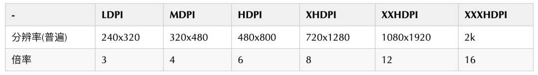 我们仅对图片的分辨率进行缩放,并不降低图片采样率,因此在显示效果上没有区别。不同 dpi 具体应该调整到多少分辨率,我们根据 Google 的定义制作了一个表格: