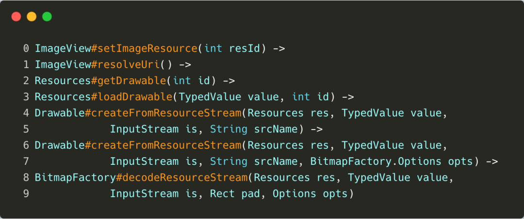 通过阅读源码,发现所有图片被加载解析成 Bitmap 的过程,最终都调用到了 BitmapFactory 中的方法。比如 ImageView 的 setImageResource() 的调用路径如下: