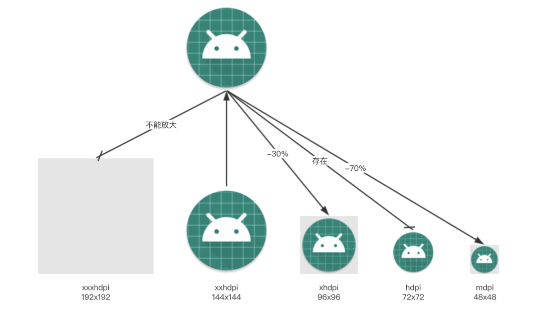 针对普通打包模式(直接产出 apk,比如抖音包),我们可以选择只保留一份分辨率偏高的的图片,这样高分辨率设备可以拿到合适的图片、低分辨率设备通过 Resource 获取时会自动进行缩放,依然可以保证合理的运行内存。