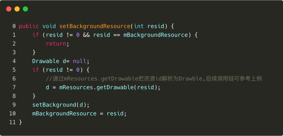 ImageView 的 setImageResource 过程,Bitmap 的创建是通过 BitmapFactory 来实现。如 View 的 setBackgroundResource(int resid)的源码如下: