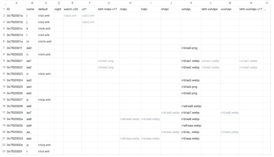 多 dpi 图片可以通过 Android 自带的 resConfig 去重,但这个配置只对资源的 qualifier 去重,比如对像素密度和屏幕尺寸不会同时做去重,抖音使用基于 AndResguard 修改的方式对 drawable 去重,可以定义不同配置的优先级和作用范围。根据优化配置确保留一份资源,优化方式如下图(灰色数据表示会被删除):