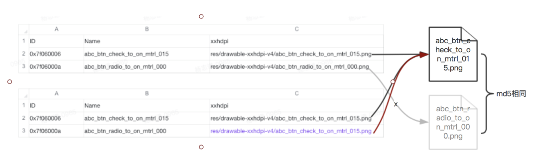 抖音选择在 AndResguard 阶段对所有的资源进行分析,对 md5 相同的资源文件保留一份,删除其余的重复的文件,然后在 AndResguard 写入 arsc 文件时进行将删除的资源文件对应的资源路径指向唯一保留的一份资源文件。优化方式如下图: