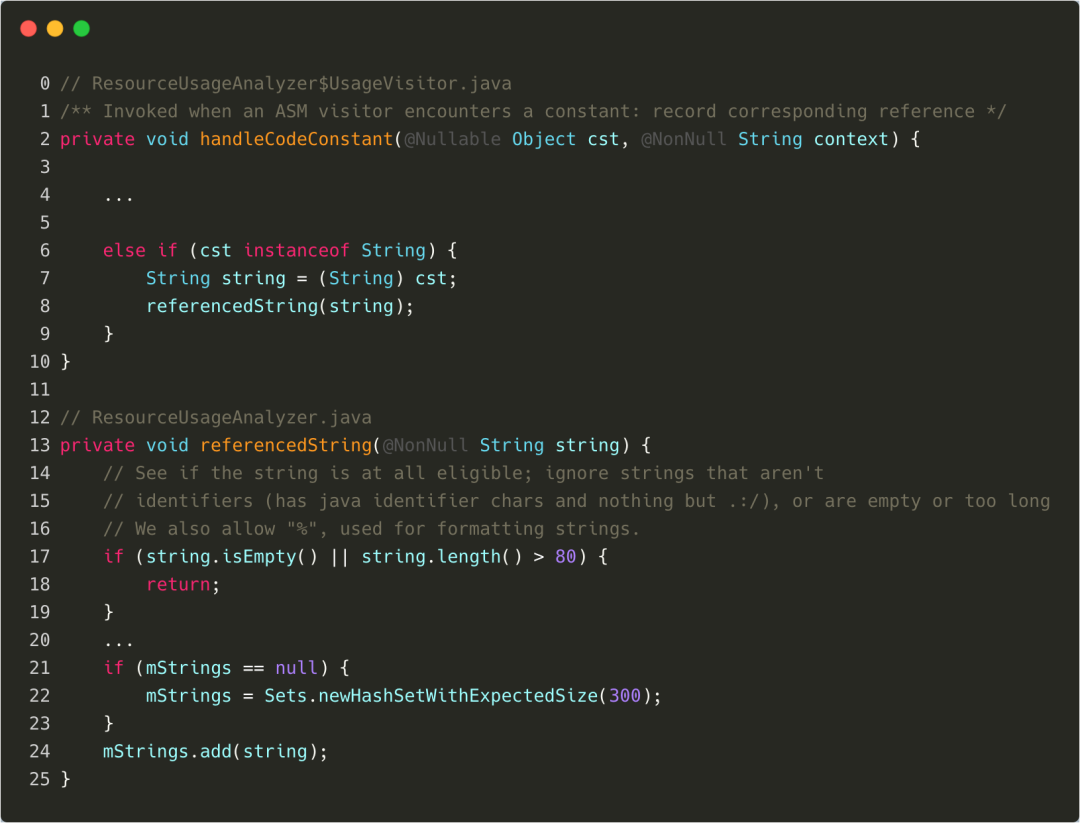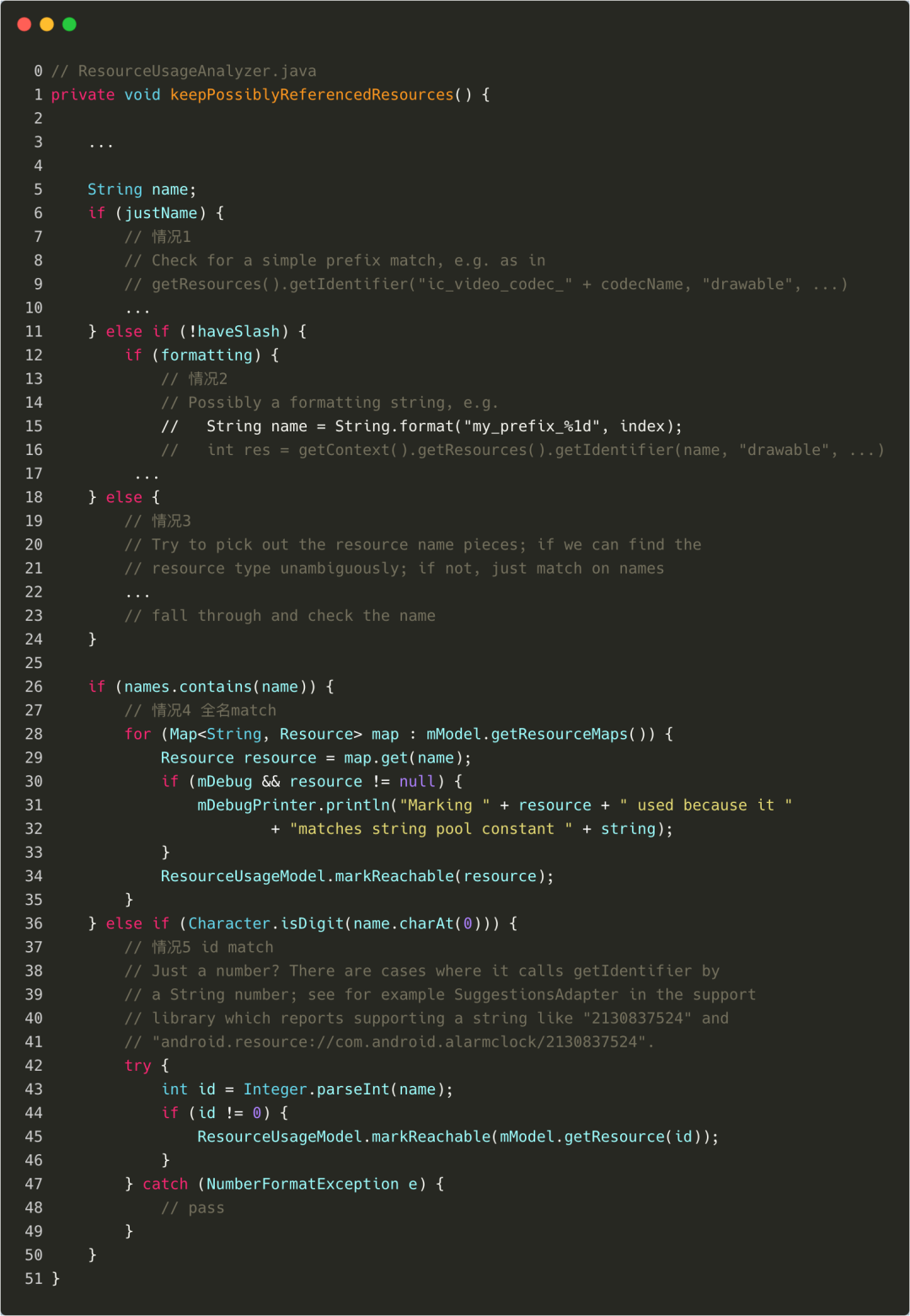 默认情况下,Resource shrink 是 safe 模式的,即其会帮助我们识别类似val name = String.format("img_%1d", angle + 1) val res = resources.getIdentifier(name, "drawable", packageName)这样模式的代码,从而保证我们在反射调用资源文件的时候,也是能够安全返回资源的。从源码来看,Resource shrink
