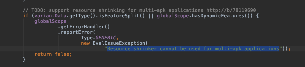 AppBundle 是 Google 近年来力推的一个功能,它能够让我们的 apk 按照不同的维度生成下发,也提供了一个动态下发功能的方式,Dynamic Feature。但是如果我们在开启 Dynamic Feature 之后使用 shrinkResources,则提示以下错误: