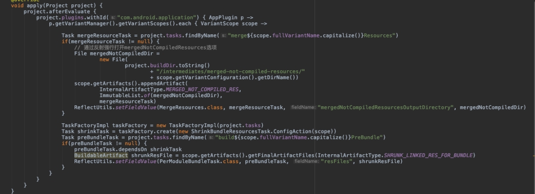 因此我们的想法便是在配置阶段不开启 shrinkResources 开关,而在后面执行资源处理任务的时候自行插入 shrinkResources 的 Task:
