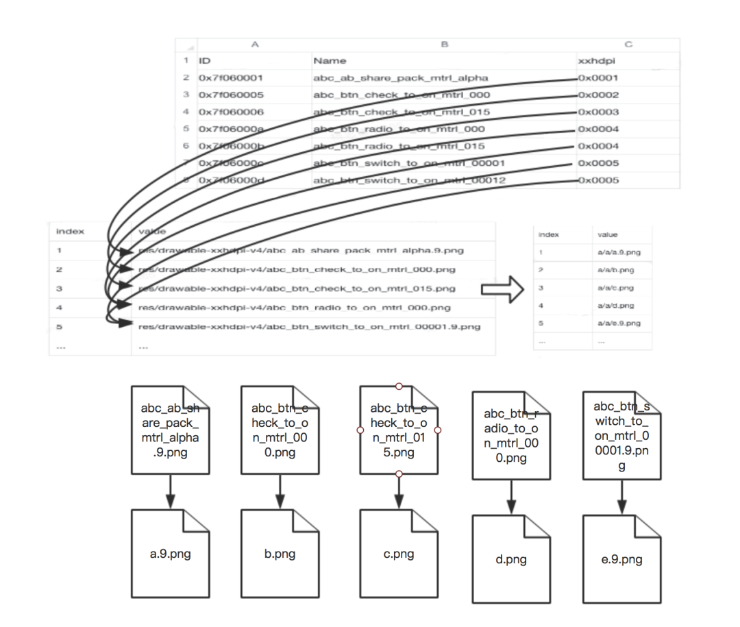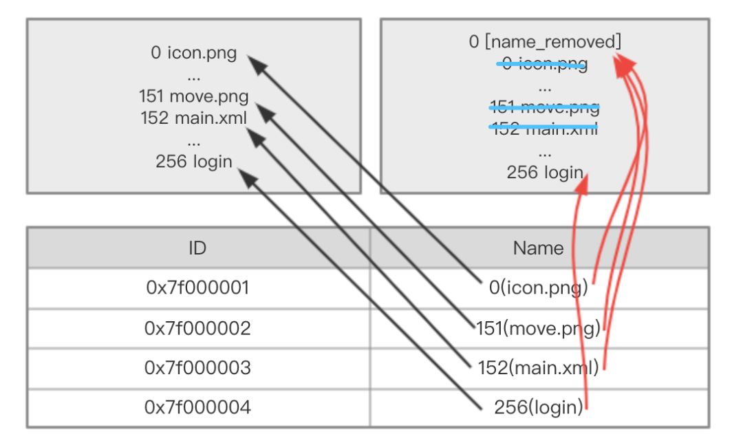 资源 id 与资源全路径的映射关系记录在 arsc 文件中,app 通过资源 id 再通过 Resource 获取对应的资源,所以对于映射关系中的资源路径做名字混淆可以达到减少包体积的效果。