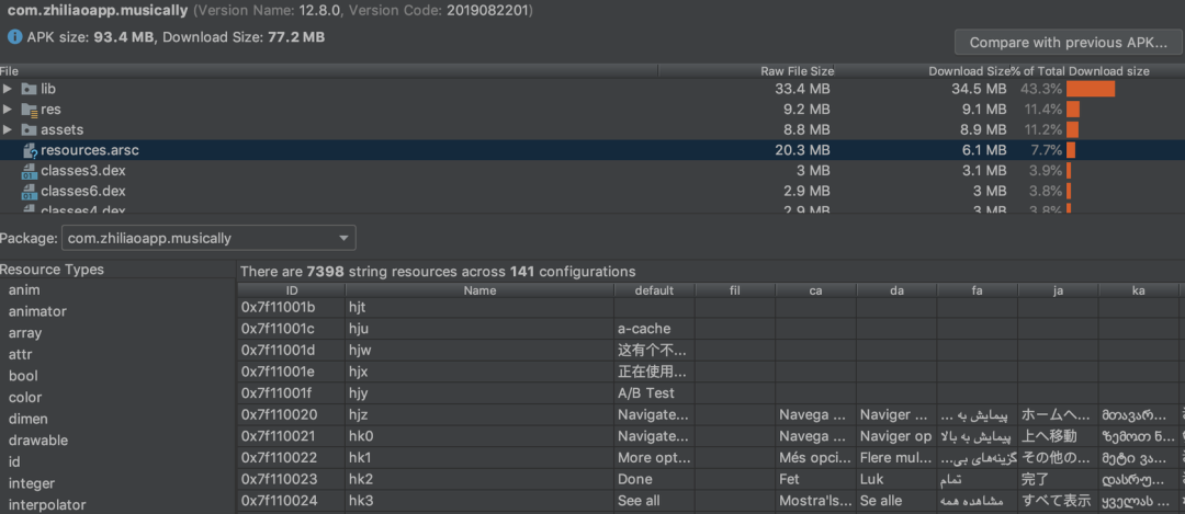 在打包过程中,其实所有 strings.xml 中保存的字符串都是不会被优化的,随着项目逐渐变大,一些废弃文案或者下个版本才有用的文案被引入了 apk 中,我们在 Proguard 后再次扫描,发现了 3000+个无用字符串。在公司内部的一些海外项目中,有的文案被翻译成 100 多个国家的语言,占用了极大的空间。