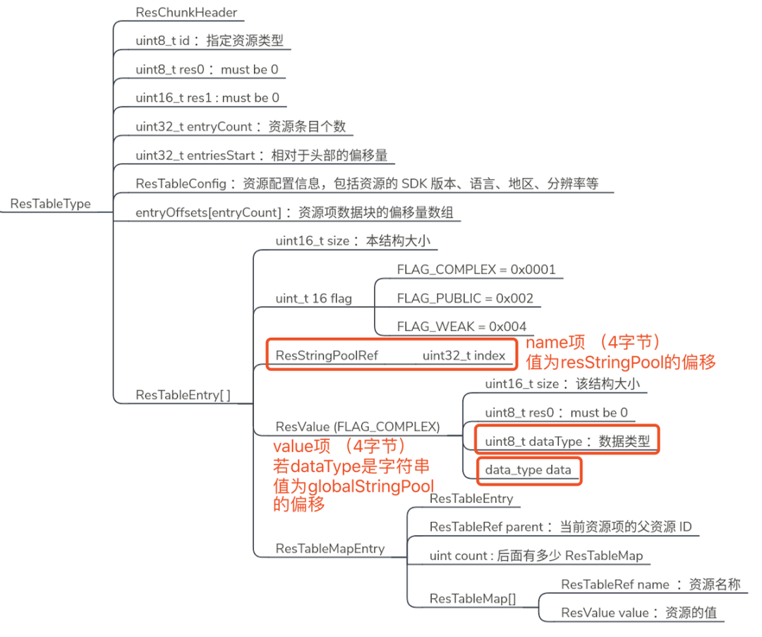 我们先遍历所有数据,然后把字符串池的重复字符串合并,记录偏移的修改,最后把需要修改的 value 的引用指向新的偏移。这个过程需要操作 arsc 数据结构的 ResValuel 和 ResTableMap,以保证所有 string 类型的值都能得到替换。