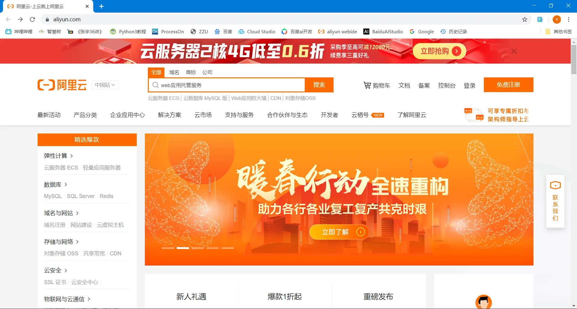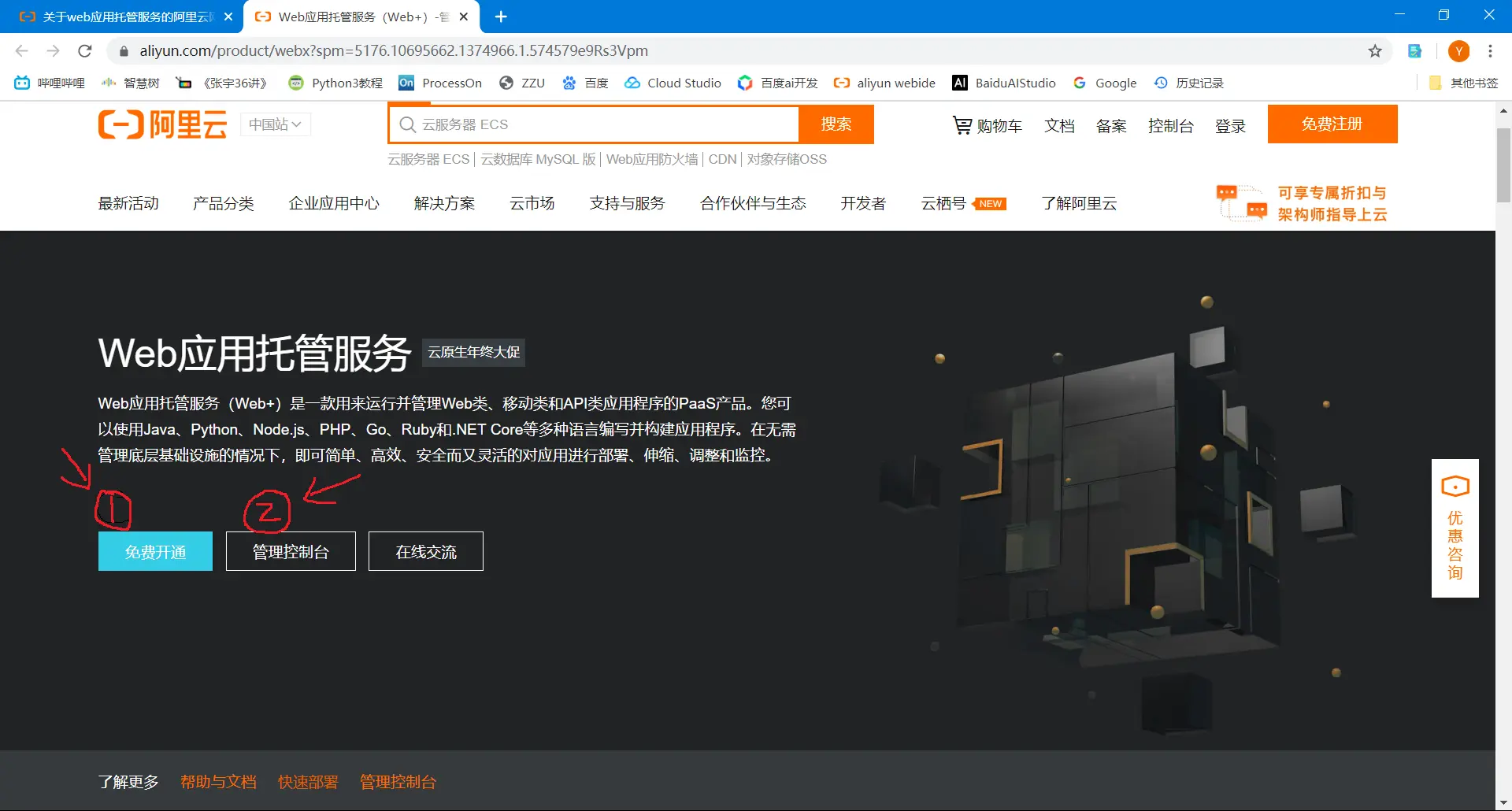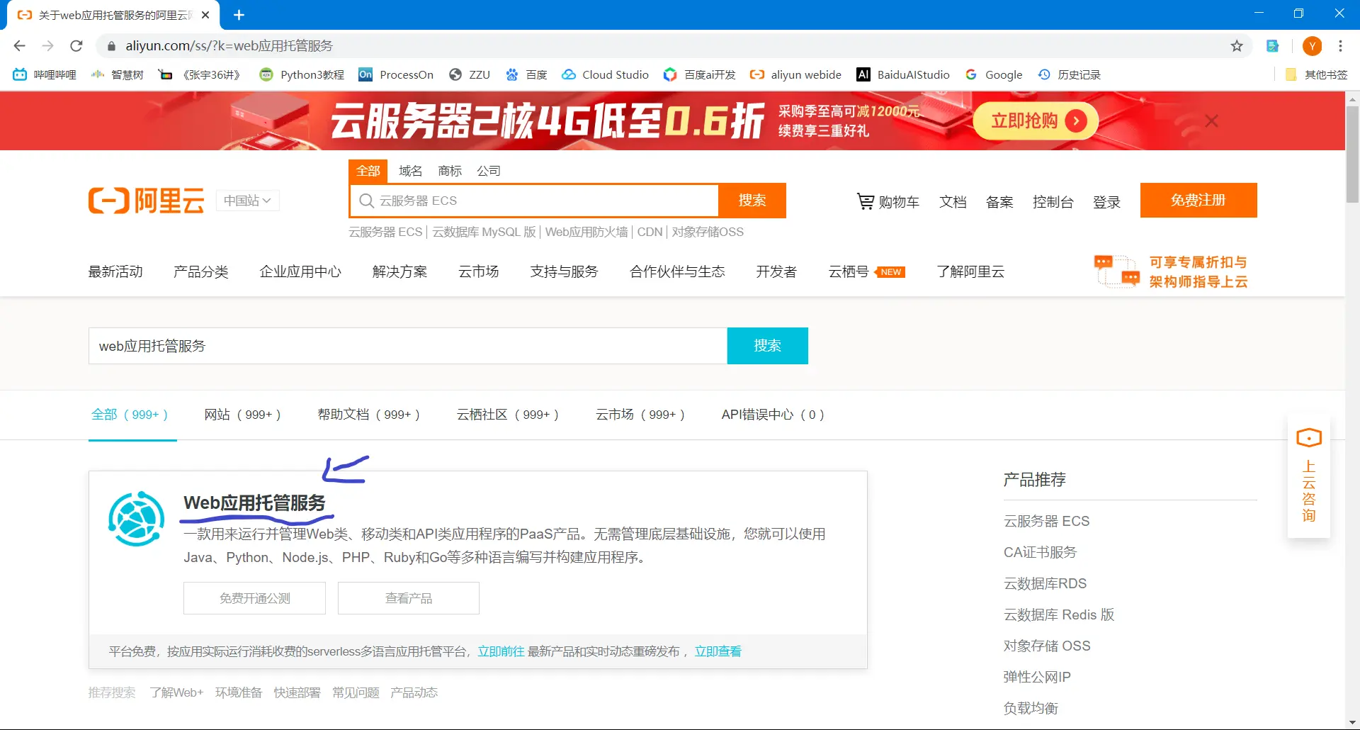 1.1打开阿里云官网,搜索栏里搜索“Web应用托管服务”