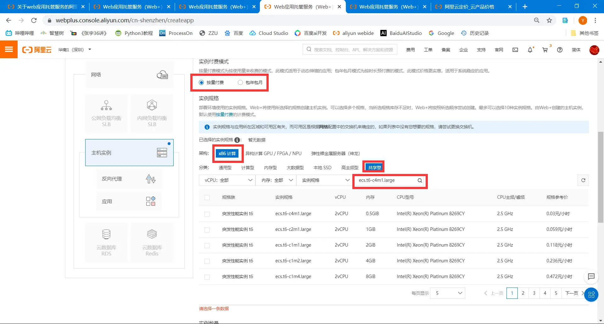 3.6选择一个ECS实例,可以选择不同的付费方式,推荐按月付费,测试的时候可以按小时付费,这里推荐一款最便宜的ecs.t6-c4m1.large。