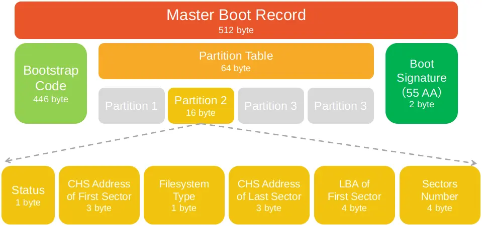 - 第1-446字节:启动过程比较简单的话,这部分代码会加载操作系统到内存,然后跳转到内存上的OS执行代码,完成启动过程。如果启动过程很复杂,启动代码会加载并执行另一个程序,由该程序完成后续启动过程