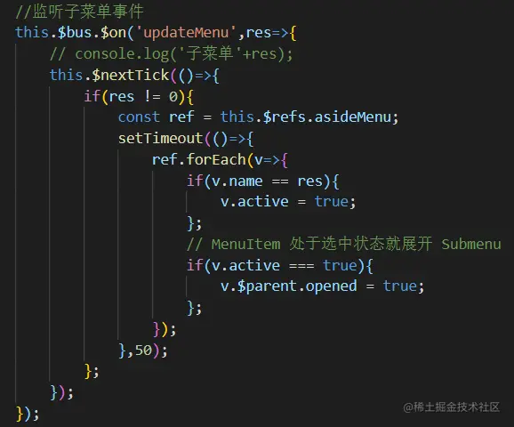 这里配合vue bus,当子菜单选中时手动展开submenu