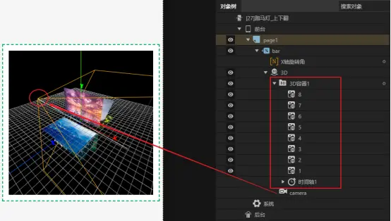 首先调整摄像机的坐标位置,然后在3D世界中添加一个3D容器,统一管理跑马灯的8张图片。