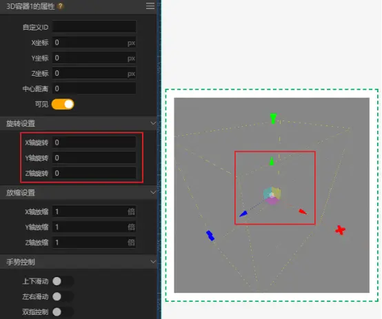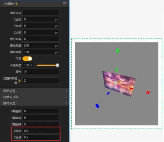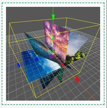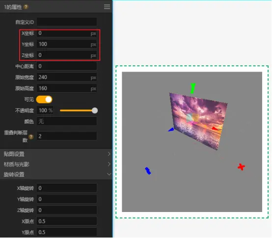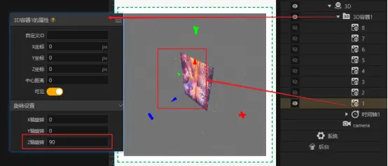 总结一下就是每个组件自身的坐标系用于作为其子组件的XYZ坐标的基准和组件自身XYZ轴旋转的基准。比如我们将3D容器Z轴旋转90度,可以看到其内部的图片1的坐标轴就随之发生了旋转。