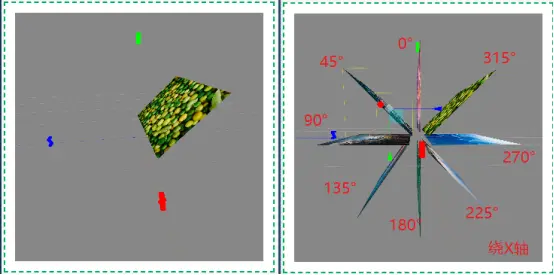 首先将8张图片的原点设置到中心点上,然后可以看到图片自身的坐标系,我们将图片参照自身Z轴旋转90°把它横过来,最后为了避免图片重叠让图片向Y轴正方向移动一定距离,设置图片的Y轴坐标为100。