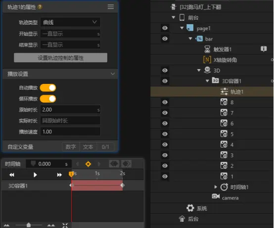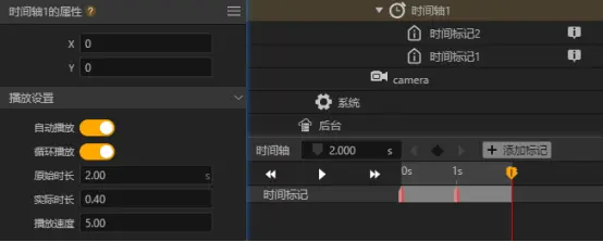 我们给时间轴添加2个时间标记,分别在0s和1s的位置。这是因为时间轴开启了循环播放,所以它播放到2s时就会从0s重新播放,即2s与0s是同一时间点,结尾就是开头。时间标记可以添加事件,当时间轴播放到该时间点就会触发。这里是用一个数值变量来设置3D容器的X轴旋转角度,每播放到一个时间标记就给该值加10,以此来达到旋转的效果。
