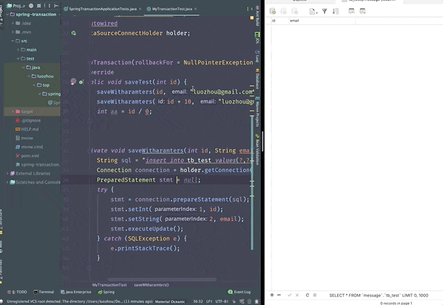 saveTest方法调用了2个插入语句,同时声明了@MyTransaction事务注解,遇到NullPointerException就进行回滚,最后我们执行了除以0操作,会抛出ArithmeticException。我们用单元测试看看数据是否会回滚。