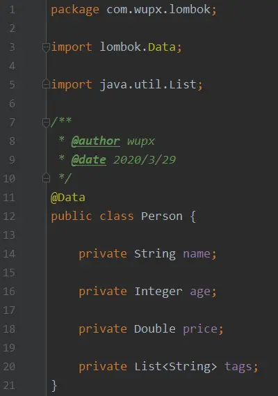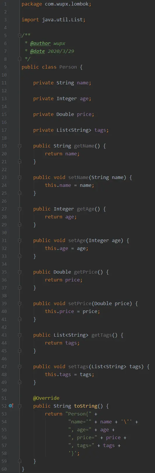 在介绍之前,先通过是否使用 Lombok 的效果来看下对比,首先来看下没有 Lombok 之前,我们的一个简单的 Java 对象(POJO)是长什么样子的: