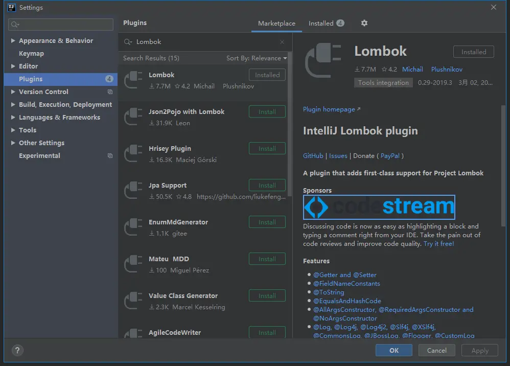 首先需要安装 Lombok 插件,我在这里是以 IDEA 2019.3.1 版本来演示的:
