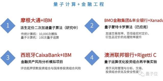 量子计算+金融,能够解决金融领域很多困难和问题,摩根大通和IBM在共同研究抬升定价二次加速量子的算法,还有其他很多银行非常感兴趣的算法。