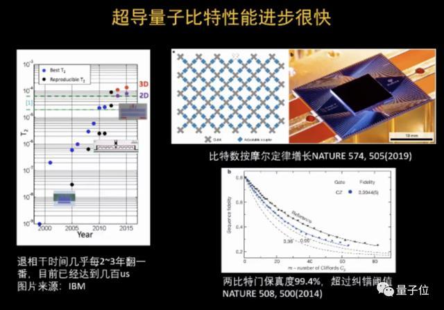 它在这几年的发展特别快,下图可以看到超导量子比特退相干时间大概有两到三年就会翻一倍,现在整个量子比特的性能已经比十年前、十五年前要好得多。