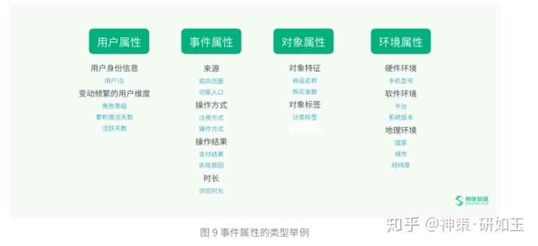 属性设计:回到刚刚领券的场景,要深入了解各个券的吸引力和营销效果,需要对比分析不同券的数据表现,那么关于 券的维度属性,例如优惠券 ID、优惠券类型、优惠券面值、优惠券适用条件、优惠券有效期等属性就非常关键了。值得强 调的点是,在属性设计时,除了维度全面之外,还必须保证每一个属性都是独立采集,比如优惠券类型和领取方式不合并 字段,以保证后续灵活的下钻分析。以下是埋点采集中常见事件属性的类型举例,主要包含用户属性、事件属性、对象属 性和环境属性四大类,并列举了一些常见的字段供参考,帮助大家完善和核对属性设计的完善性。当然,要对属性设计做 到游刃有余,核心还是要熟悉业务场景和分析诉求,知道哪些维度会影响业务的数据表现,做到心中有数,才会游刃有余。
