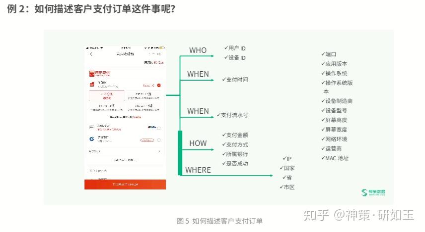 针对支付订单事件,强关联的属性也会在 HOW 中,比如支付金额、支付方式(信用卡 or 储蓄卡 or 微信等)、所属银行、 是否成功。“是否成功”是一个非常典型的属性,我们判断用户“是否支付成功”,其触发机制必须等到前端拿到后端服务 器处理结果后,再进行上报。如果我们希望了解的是,“用户是否有意愿支付”,那么当用户点击“支付订单”这个按钮时, 进行前端采集即可,这部分在接下来的内容还会做重点介绍。