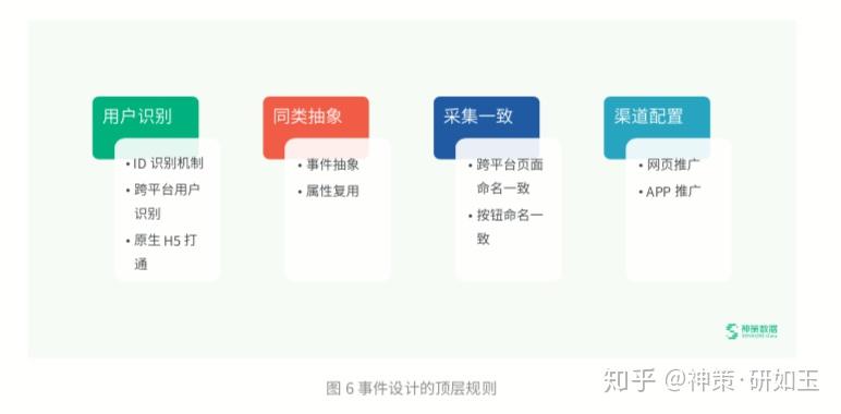 事件设计的顶层规则包括用户识别机制、同类抽象、采集一致、渠道配置四方面,这是保证数据采集的准确性、数据环境 可用性的基础。下面进行详细介绍: