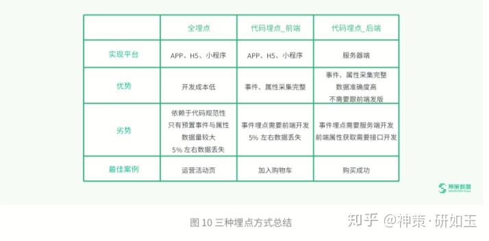 目前埋点采集业态下,常见的采集方式,包含全埋点、代码埋点 - 前端、代码埋点 - 后端三种,以下是这三种方式在主要 维度的对比,方便大家在做事件设计的时候,能根据需求和场景,科学的选择最合适的埋点方式。