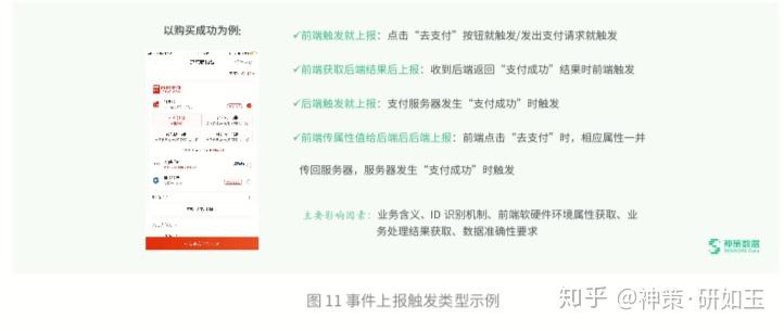 后端触发就上报:这种方式是指后端处理后直接上报,比如后端处理付款请求出结果时直接后端触发上报。采用这种 方式的主要好处是数据不会出现漏报,但也由于是直接后端上报,基本是拿不到用户的设备终端及软硬件环境属性的,比 如用户在支付时用的是什么设备、网络环境是什么等信息。