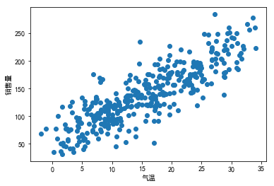1 2 3 4 5 6 7 8 9 | import pandas as pdicecream = pd.read_csv("icecream.csv")import matplotlib.pyplot as pltimport pylabplt.rcParams['font.sans-serif'] = ['SimHei']plt.scatter(icecream.iloc[:,1],icecream.iloc[:,0])plt.xlabel("气温")plt.ylabel("销售量")pylab.show() |