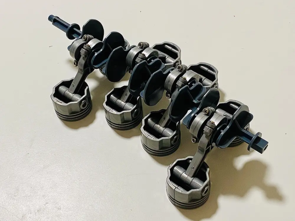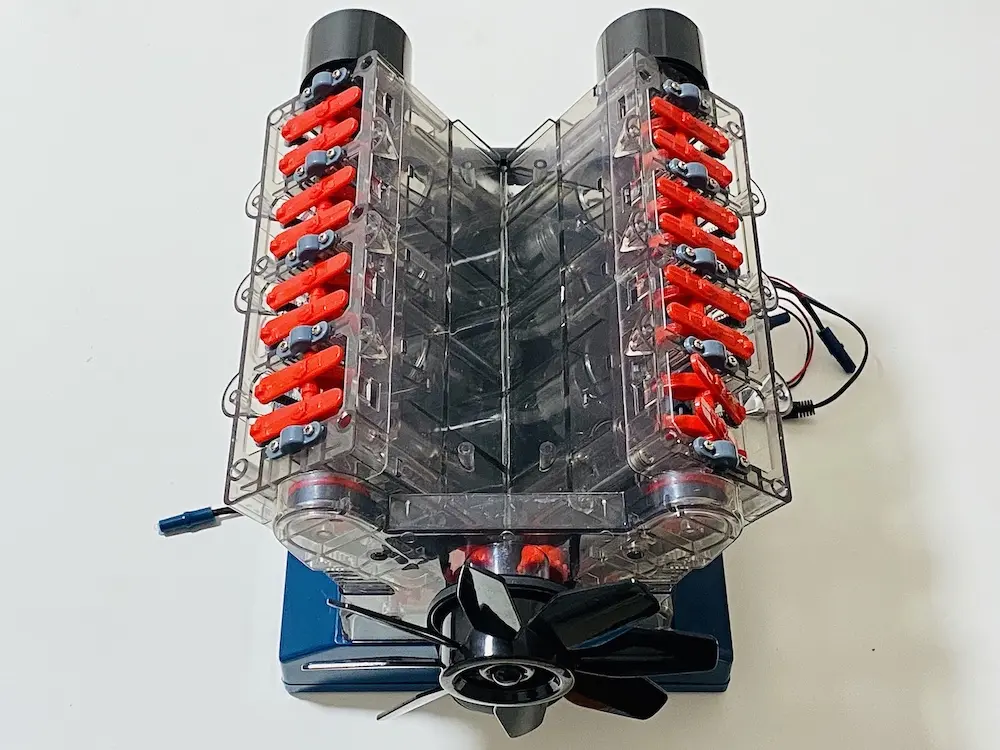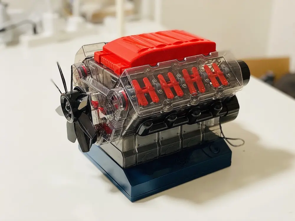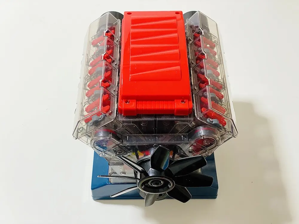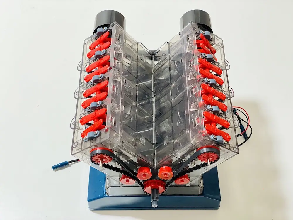 引擎是一种机械设备。它通过燃烧燃料,将热能转换为机械能。V8 引擎属于典型的四冲程引擎,这表明其气缸具备四种状态(进气、压缩、作工、排气)。V8 引擎具备 8 个这样的气缸,它们被布置为以一定夹角分开的两组。这些气缸被均匀地分开,使得引擎工作中的任一时刻,每个冲程状态下均存在 2 个气缸。这些气缸轮流进入燃烧燃料的做功冲程,从而使引擎持续不断地运动起来。整个引擎的运行,是通过一套由「正时皮带 + 凸轮轴 + 摇臂轴」组成的系统控制的。
