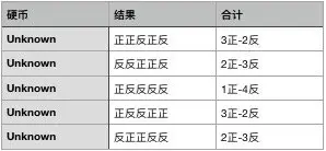 每次实验我们一共进行5次,记录下正反面的个数。经过5轮实验之后,我们得到的结果如下: