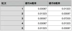其实是有的,相比于直接猜测某个轮次当中选择了哪一枚硬币,我们可以用选择硬币的概率来代入来计算期望,这样的效果会更好,比如根据刚才的计算结果,我们可以算出每个轮次当中选择硬币的概率: