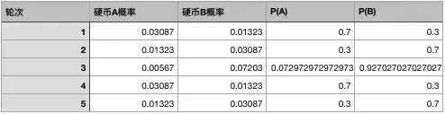 比如第一轮当中,出现的结果是3正2反,如果是A硬币,出现这样结果的概率根据二项分布很容易计算:,同理,我们可以算出硬币B的概率是0.01323。我们用同样的方法算出所有的概率: