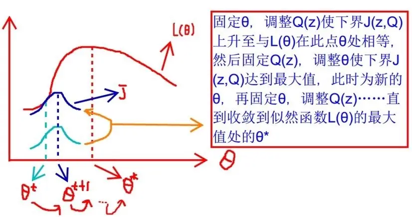 上面这个不等号右边的式子就容易求解多了,当我们固定z变量的时候,我们可以很方便地求解似然最大时的参数。同理当我们有了